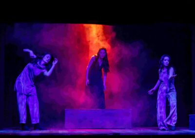 Le coordinate spaziali e temporali del “non-luogo” si concretizzano in uno spazio scenico aperto, dominato dalla spirale del rogo, nella quale Giovanna vivrà le sue visioni, dall’illuminazione della luce a quella delle fiamme.